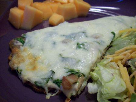 - While your crust is in the oven, prepare your toppings. I used part of a jar of alfredo sauce, some leftover chicken from a Costco rotisserie, fresh spinach, and mozzarella. I cut the chicken into small pieces and the spinach into thin strips with a pair of scissors.