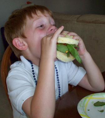 I made the microwave hamburger buns for our dinner. Andy deemed them a success. Because Braden hadn’t appreciated the flax seed meal ones yesterday, I made him one with rice flour (same ratios), which he thoroughly enjoyed. Yeah, it was a little too big for his mouth, lol.