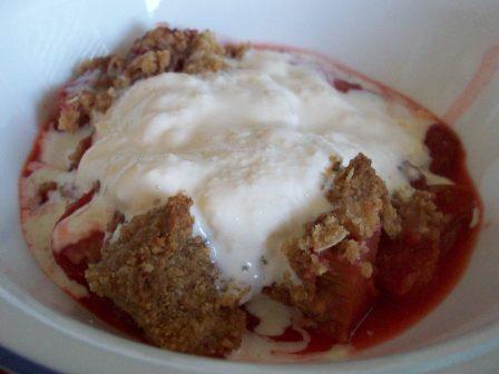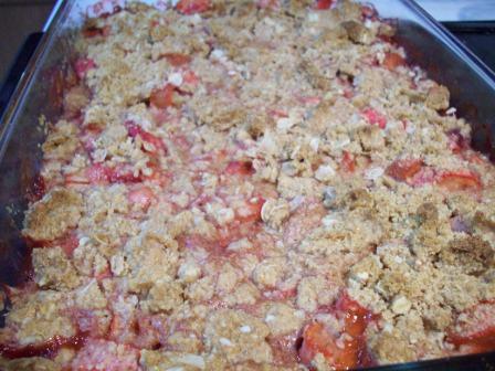 Bake in a preheated 350° oven for 35 minutes or until rhubarb is tender and the topping starts to brown. Serve warm or cold.