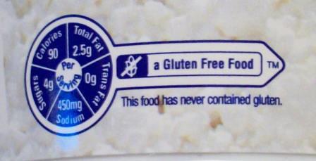 There is a little wheel with segments for calories, total fat, trans fat, sodium, and sugars. Sticking out of the wheel is a line (imagine a key, that is what the whole thing resembles). A little picture of a grain with a slash through it, and the words “a Gluten Free Food” are just sitting right there! (I wonder how many times I’ve bought this and not seen it.) Under the little symbol, it says “This food has never contained gluten.”