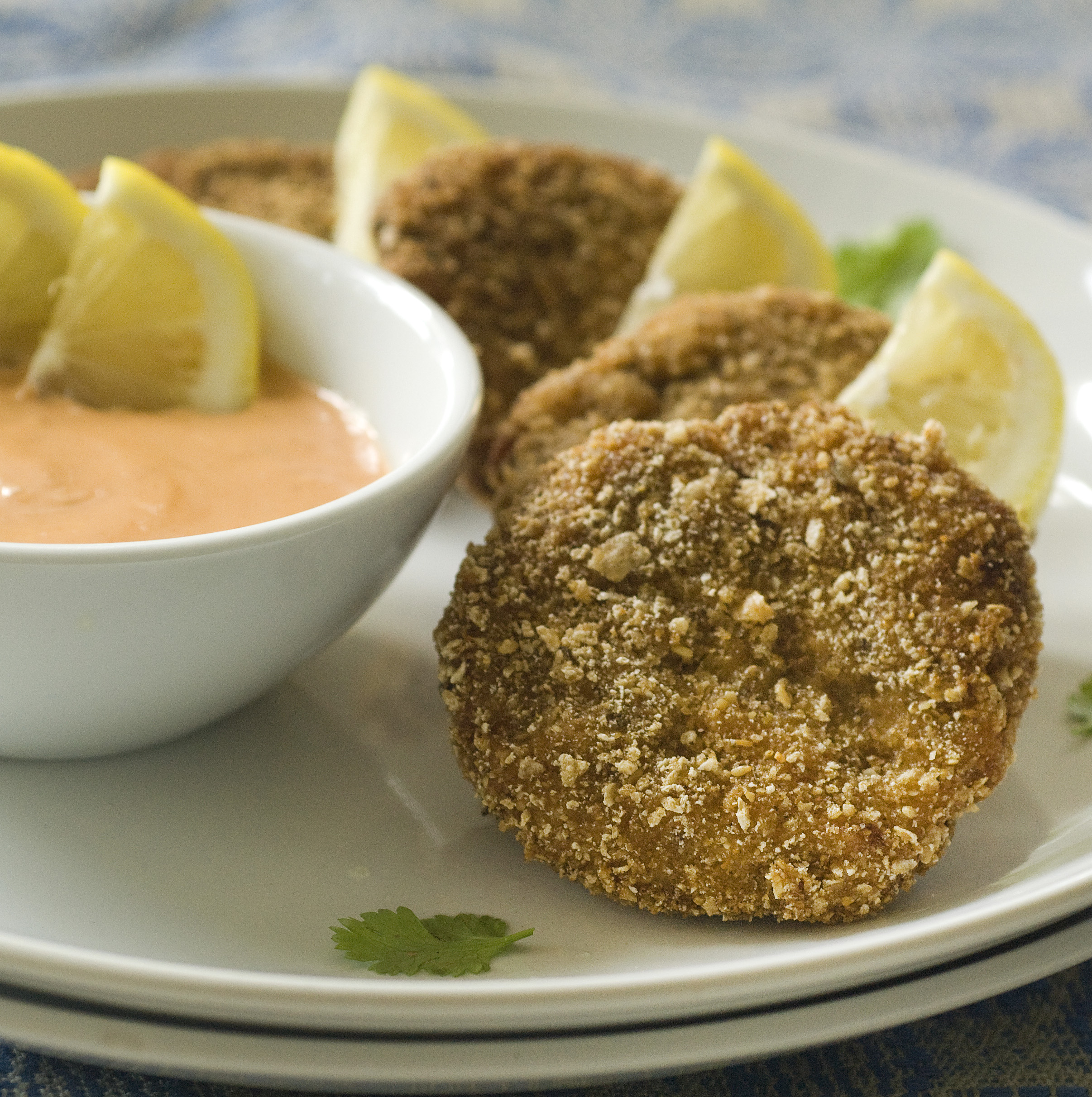 Serve the crab cakes with the creamy cocktail sauce and lemon wedges.