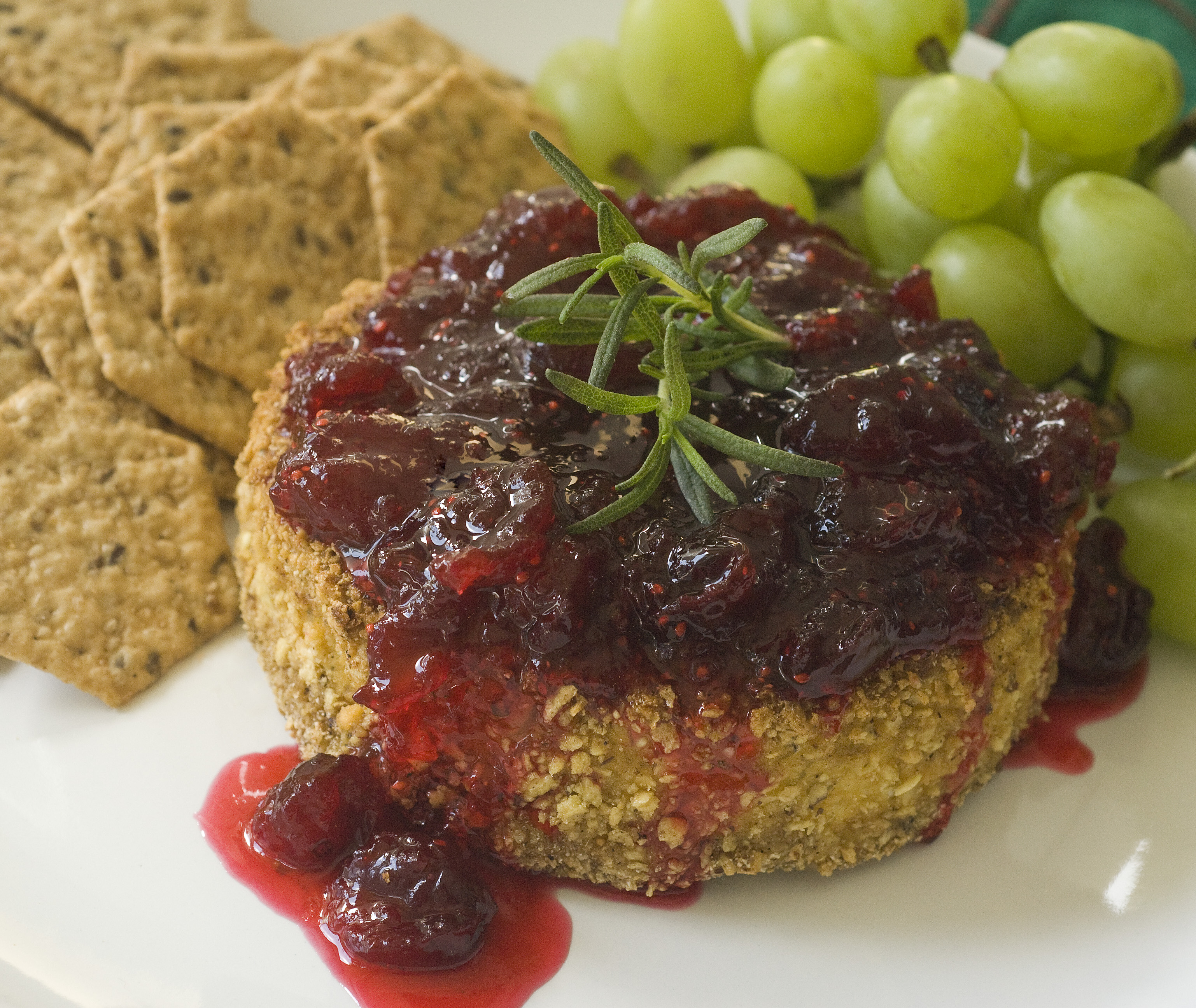 Put the flour, egg and cracker crumbs on individual dinner plates. Coat the brie first in the flour, then the egg and finally the cracker crumbs, making sure it is completely coated. Heat the olive oil and butter in a medium skillet over medium heat. When the butter is melted and the oil is hot, add the brie and cook for about 2 minutes per side or until golden brown. Place the brie on a serving plate and top with the cranberries. Serve with crackers.