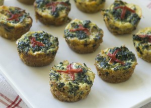Whisk the eggs and milk together and spoon into the muffin cups; do not fill all the way.  Top with the roasted red pepper slivers and bake until set and browned, about 20 minutes.