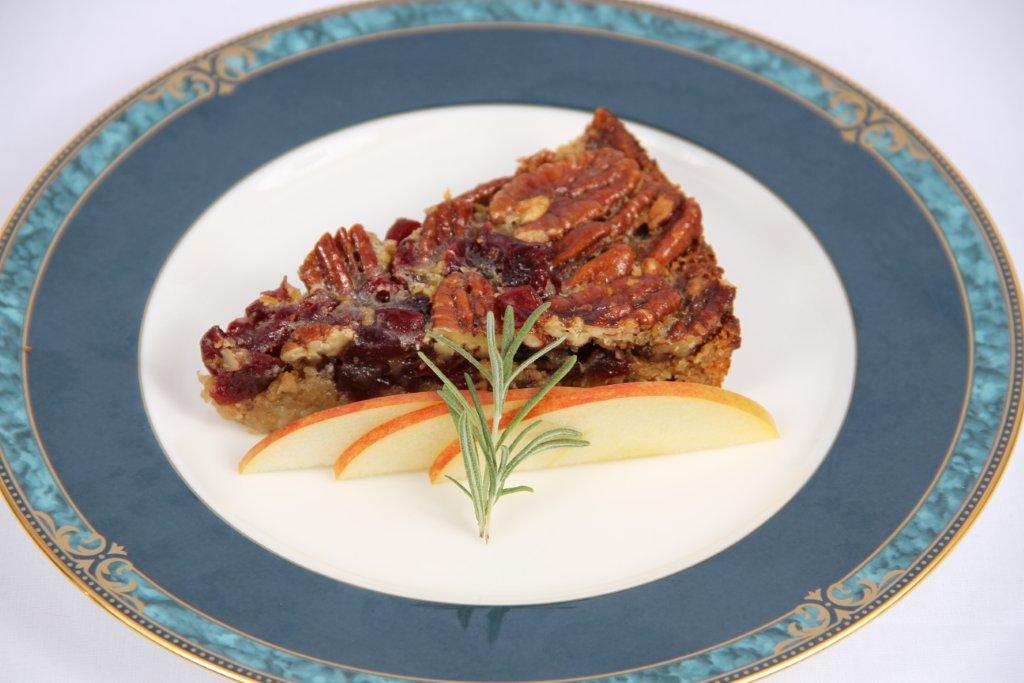 In another large bowl, combine sugar, egg, corn syrup, vinegar, butter, vanilla extract, tahini, and salt. Mix until smooth. Gently stir in dried cranberries and roasted pecans. Pour the filling mixture into the prepared crust, spreading evenly.
