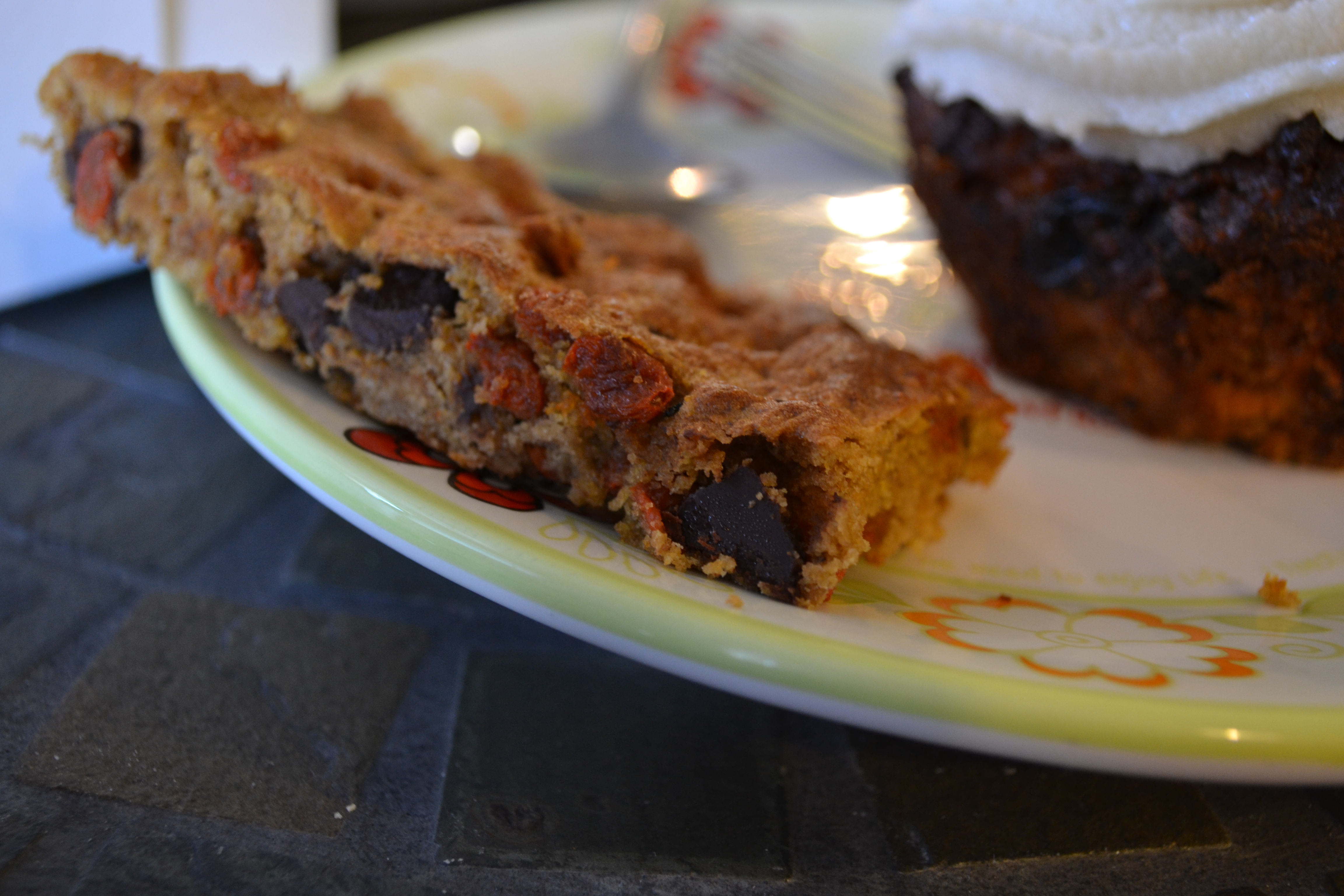 As you can see from the inside, there are lots of nuts to boost the protein content. Â My first thought was that there were too many nuts (I never use nuts in my carrot cakes), but the more I ate of it, the more I realized those nuts were very important to this cake. Â I really enjoyed it. Â The icing was great, too (Monica was prepared to eat her half of the icing), but it didn’t leave me feeling like junk. Â Because there’s no junk in it.