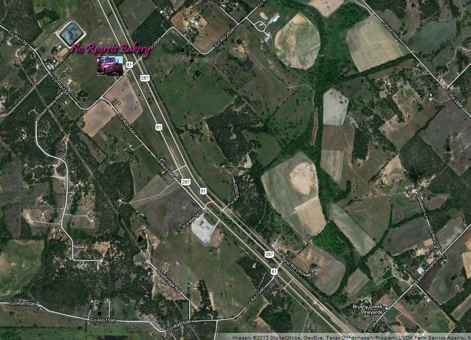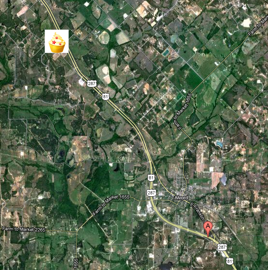 About 25 minutes west of I-35, on Highway 297, is one of many small towns. Â Welcome to Alvord, TX, population 1,334. Â I never even knew this town existed, and it’s only 45 minutes away from me! Â Google maps was absolutely no help, so we called the bakery to get directions. Â Another 3 miles and turn at the bright pink truck.